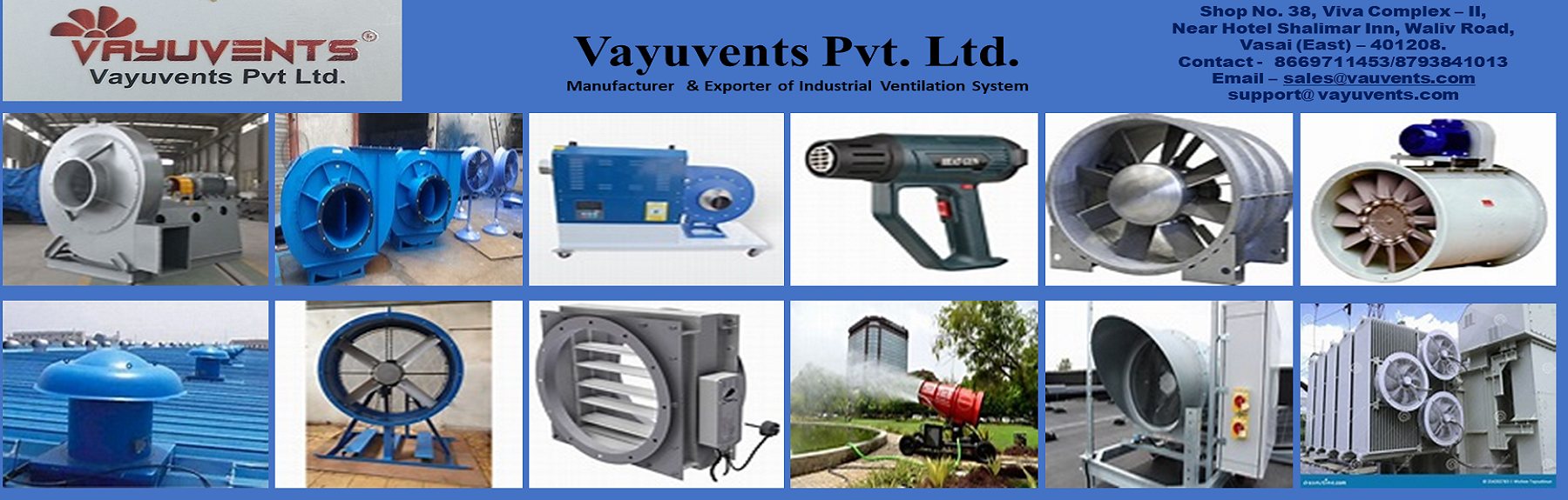 manufacturer and exporter of Axial Flow Fan , Centrifugal Blower, Cyclone Dust Collector , Pulse Jet dust collector, Hot Air Blower, Motorized Roof Exhaust Fan, Roof Ventilator fan , Power Driven Roof Extractor Fan, ID Fan, FD Fan, Tube Axial Fan, Air Washer Unit, Industrial Ducting System, Industrial Blower, Ventilation and Pollution Control MachinesĀ