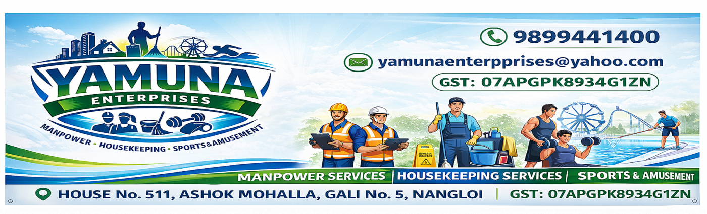 Yamuna Enterprises is a service-oriented company dedicated to delivering professional manpower, housekeeping, and sports amusement services. The company supplies skilled, semi-skilled, and unskilled manpower including helpers, supervisors, managers, data entry operators, and gardeners to support various operational and administrative needs of organizations.