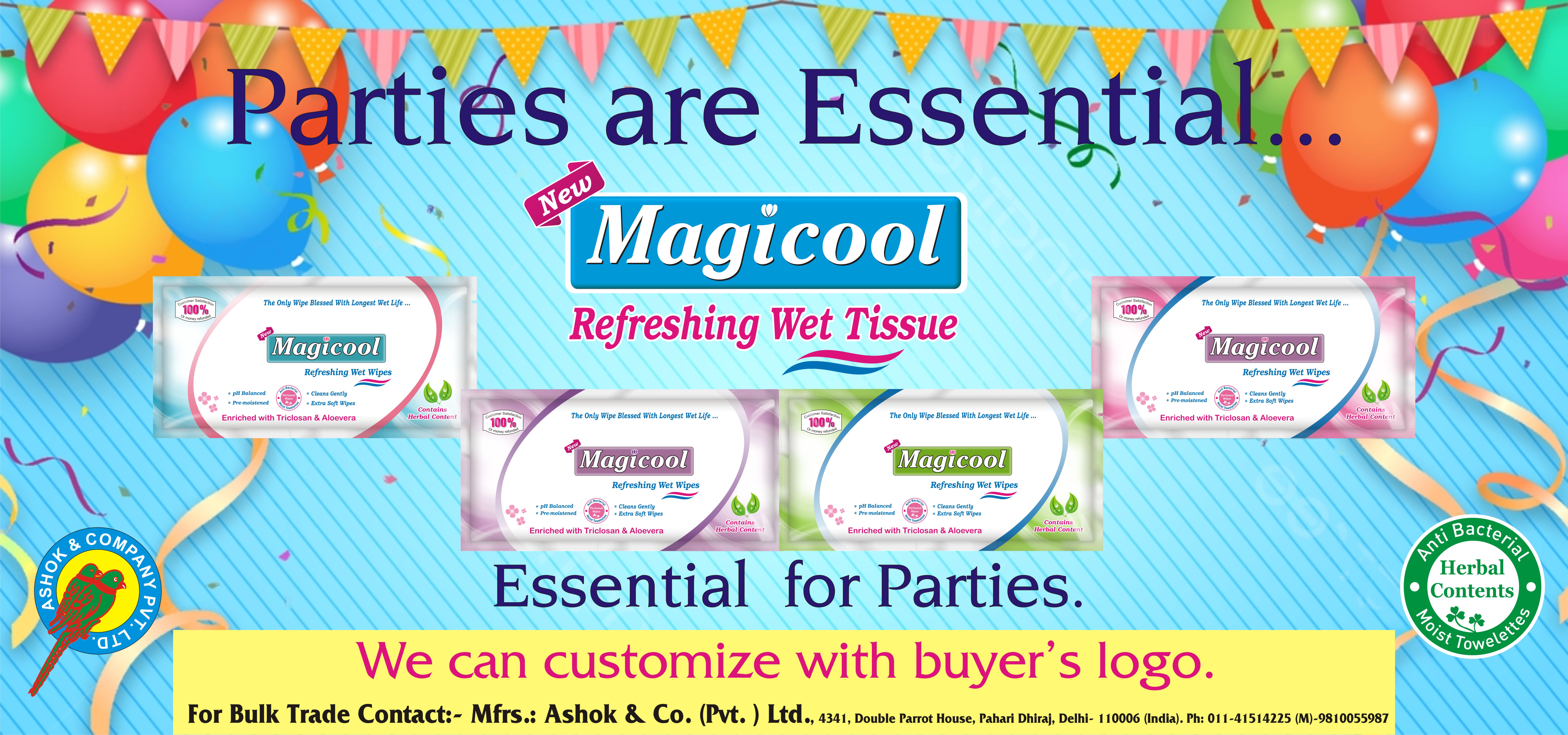 WELCOME TO THE WORLD OF HYGIENE: ASHOK & CO. (PVT.) LTD. (A.C.P.L.) established by Mrs. and Mr.A.K. Jain on the values of Quality, Innovation and Trust in the year 1979. A.C.P.L. has originate to various leading brands, nurtured them with our experienced excellence to make them legends such as Double Parrot Pan Bahar, Prince, Pukhraj and Tiket Etc.. A.C.P.L. engaged in manufacturing Personal / Health Care, Home Care and Car Care products as per International Standards which are completely user friendly. Our company is one of the largest Manufacturers of all kinds of Herbal Mouth Freshners, Wet Wipes, Soft Tissues, Fragrances, Flavours and Perfumery of all kinds in India under own world renowned brands MAGICOOL, MAGICLEAN, MEDICLEAN, FRESHBA...